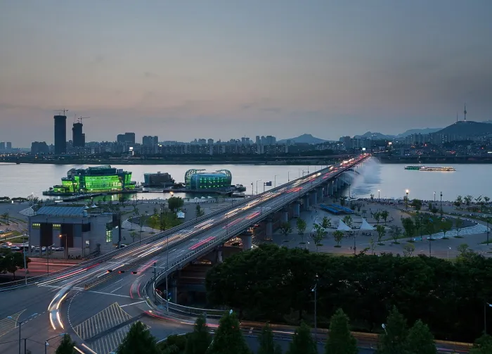 Banpo Hangang Park is located on the southern side of the river centering on Banpo Bridge (Jamsu Bridge) between Hamnam Bridge (upstream) and Dongjak Bridge (downstream). The Rainbow Fountain built on both sides of Banpo Bridge was registered in The Guinness Book of Records in 2008 as the longest bridge fountain in the world with a total length of 1,140 meters. At night, over 200 lights create a fantastic view of a beautiful rainbow.